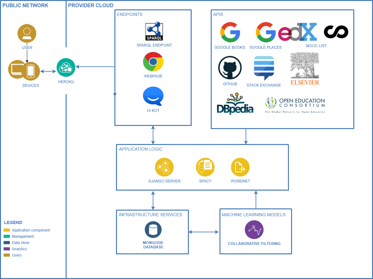 The main server will be written in Python using the Django framework. For SPARQL and RDFa funcionality we will use RDFlib. For querying the APIs we will use the requests library and for scraping recevied data when neccesary we will use BeautifulSoup. For parsing natural language we will use spaCy and Wordnet using NLTK's interface. We will also use Surprise for its implementation of Collaborative Filtering. For the frontend we will use React to make an UI bot and website along with a SPARQL endpoint.